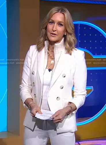 Lara Spencer on Good Morning America on ABC was spotted wearing this white double breasted blazer on Good Morning America on Mar 09 2023's episode. Lara's Jacket is the Miller Dickey Jacket by Veronica Beard.