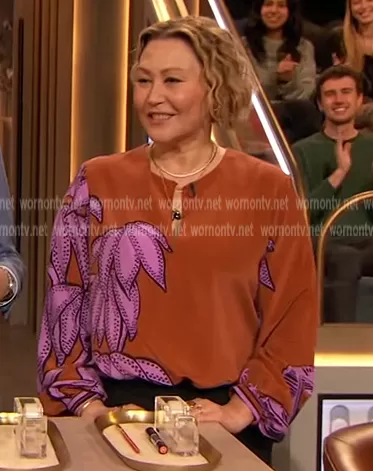 on The Drew Barrymore Show on CBS was spotted wearing this orange floral print blouse on The Drew Barrymore Show on Feb 28 2023's episode. 's Top is the Tropical Balloon-Sleeve Blouse by Johanna Ortiz.