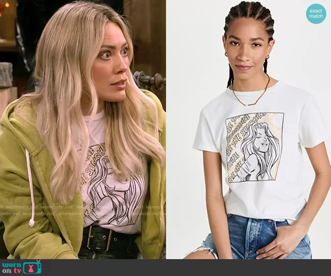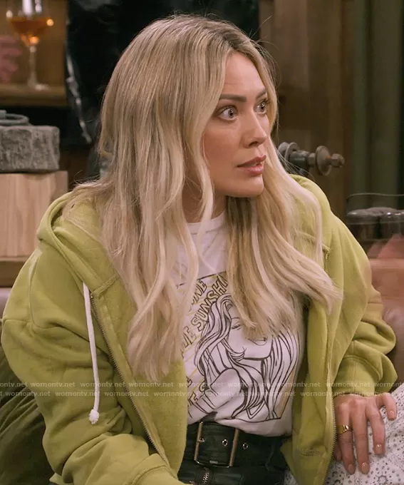 Sophie (played by Hilary Duff) on How I Met Your Father on Hulu was spotted wearing this graphic tee and green hoodie on How I Met Your Father on episode 'Universal Therapy' (2x06) in Feb 2023. Sophie's Top is the Be The Sunshine Classic Tee by Re/Done.