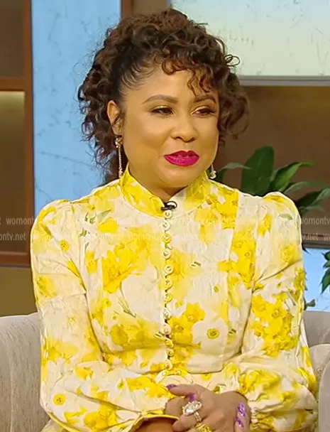 on Tamron Hall Show on ABC was spotted wearing this yellow floral print mini dress on Tamron Hall Show on Mar 01 2023's episode. 's Dress is the Wonderland belted floral-print linen mini dress by Zimmermann.