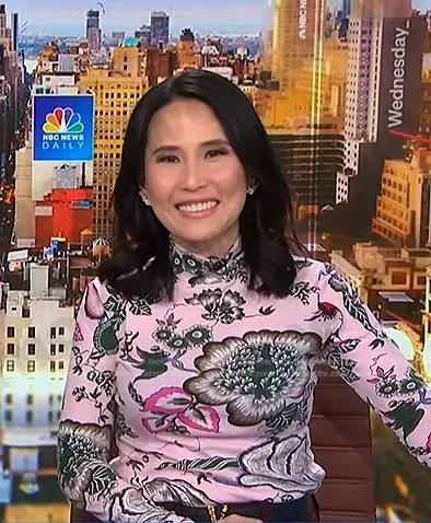 Vicky Nguyen on NBC News Daily on NBC was spotted wearing this pink floral turletneck top on NBC News Daily on Oct 25 2023's episode. Vicky's Top is the Kyra Turtleneck top in Pink Happy Times by Tory Burch.