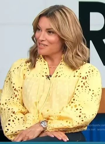 Kit Hoover on Access Hollywood on NBC was spotted wearing this yellow lace blouse on Access Hollywood on May 31 2024's episode. Kit's Top is the Lace Tassel Top by Aqua.
