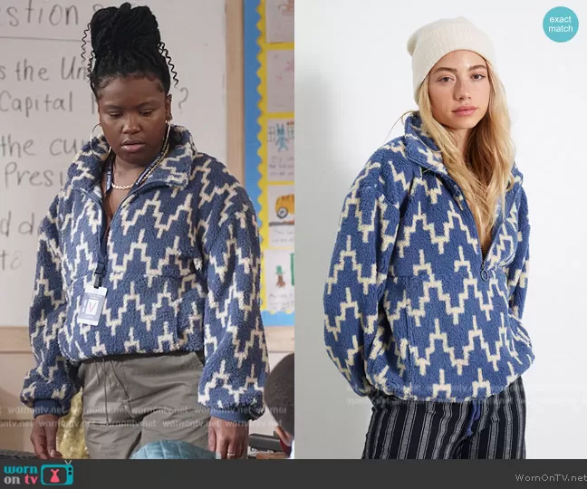 (played by Courtney Taylor) on Abbott Elementary on ABC was spotted wearing this blue printed sherpa sweater on Abbott Elementary on episode 'Mural Arts' (2x17) in Mar 2023. 's Sweater is the Billabong Time Off Sherpa Half-Zip Sweatshirt.