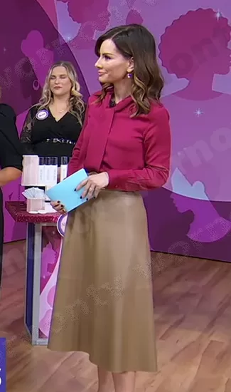 Rebecca Jarvis on Good Morning America on ABC was spotted wearing this beige leather skirt on Good Morning America on Oct 14 2023's episode. Rebecca's Skirt is the Cape Skirt with Belt by Zara.