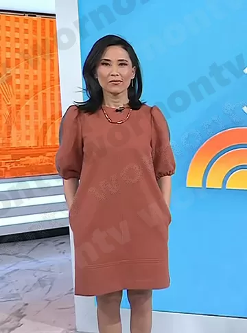 Vicky Nguyen on Today on NBC was spotted wearing this pink puff sleeve shift dress on Today on Dec 11 2025's episode. Vicky's Dress is the Colorblocked Mini Dress by Toccin.