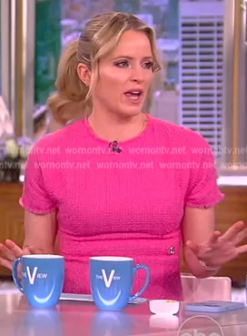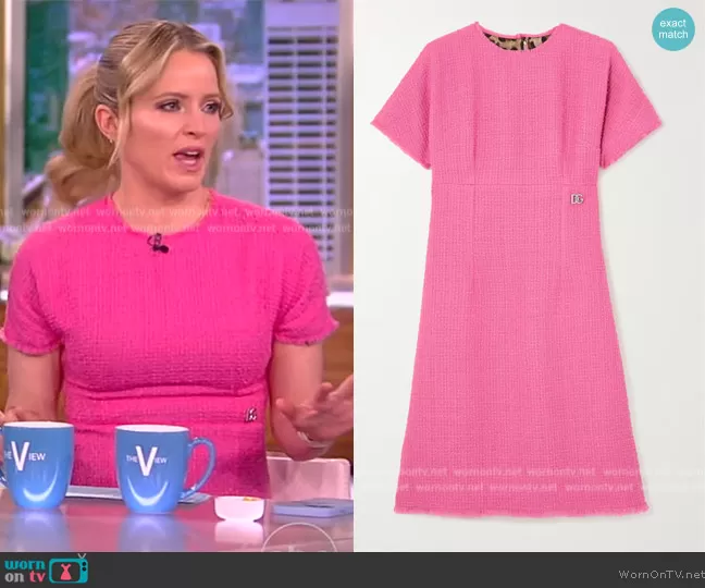 Sara Haines on The View on ABC was spotted wearing this pink tweed dress on The View on Mar 04 2023's episode. Sara's Dress is the Raschel embellished wool-blend tweed mini dress by Dolce & Gabbana.