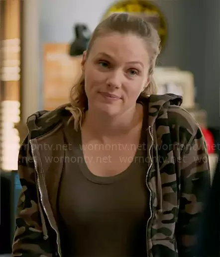 Hailey Upton (played by Tracy Spiridakos) on Chicago PD on NBC was spotted wearing this camo zip up hoodie on Chicago PD on episode 'Retread' (11x02) in Jan 2024. Hailey's Sweatshirt is the Camouflage French cotton-terry hoodie by Nili Lotan.