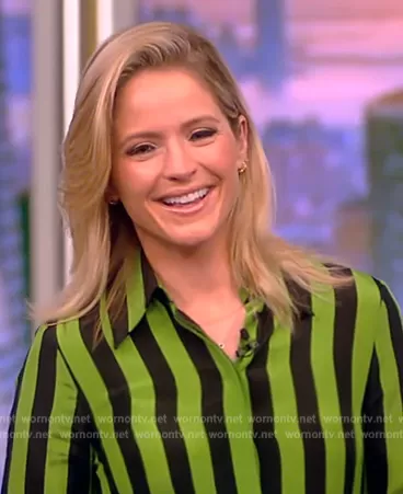 Sara Haines on The View on ABC was spotted wearing this green stripe shirt on The View on Mar 06 2023's episode. Sara's Top is the Alane Striped Shirt by Alice + Olivia.