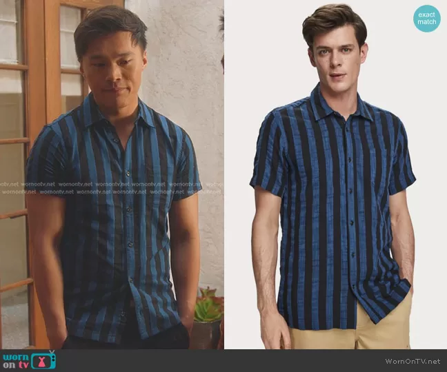 Albert Han (played by John Harlan Kim) on 9-1-1 on ABC was spotted wearing this blue striped shirt on 9-1-1 on episode 'In a Flash' (6x10) in Mar 2023. 's Shirt is the Striped Cotton Short Sleeve Shirt by Scotch & Soda.
