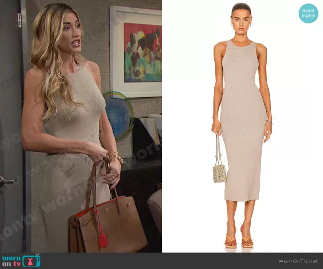Sloan Peterson (played by Jessica Serfaty) on Days of our Lives on Peacock was spotted wearing this knit dress and beige tote bag on Days of our Lives on Mar 07 2023's episode. Sloan's Dress is the Ribbon Midi Dress by Helmut Lang . Sloan's Bag is the Walker Satchel Tote by Tory Burch .