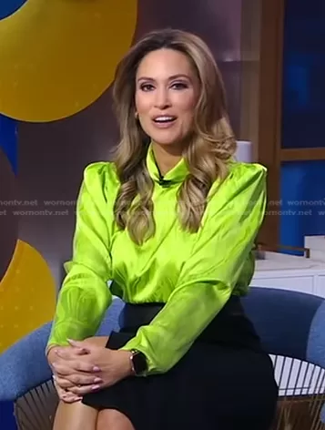 Rhiannon Ally on Good Morning America on ABC was spotted wearing this lime green long sleeve top on Good Morning America on Mar 07 2023's episode. Rhiannon's Top is the Satin Top by Ronny Kobo Collective.