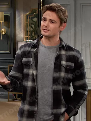 Johnny DiMera (played by Carson Boatman) on Days of our Lives on Peacock was spotted wearing this black plaid shirt on Days of our Lives on Dec 28 2023's episode. Johnny's Shirt is the Dale Cotton Check Button Down Western Shirt by John Varvatos.