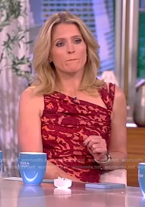 Sara Haines on The View on ABC was spotted wearing this red floral asymmetric dress on The View on Mar 08 2023's episode. Sara's Dress is the Tiggy Draped Midi Dress by Zimmermann.