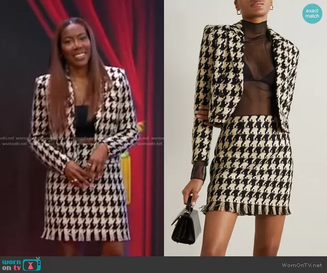 on Good Morning America on ABC was spotted wearing this houndstooth tweed blazer and skirt on Good Morning America on Mar 09 2023's episode. 's Jacket is the Inez Cropped Houndstooth Tweed Blazer by L'Agence . 's Skirt is the Livia Fringed Houndstooth Tweed Skirt by L'Agence.