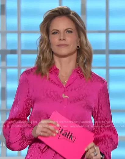 Natalie Morales on The Talk on CBS was spotted wearing this pink leopard print dress on The Talk on Jan 17 2024's episode. Natalie's Dress is the Relaxed fit printed midi jacquard shirt dress by Scotch and Soda.