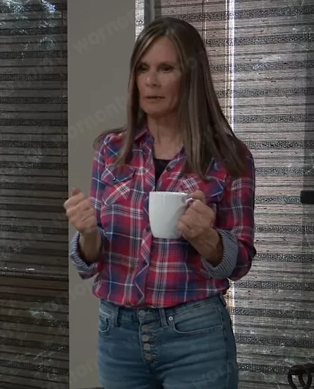Lucy Coe (played by Lynn Herring) on General Hospital on ABC was spotted wearing this red plaid shirt on General Hospital on Mar 10 2023's episode. Lucy's Shirt is the Kendra Shirt in Scarlet/Blue by Rails .