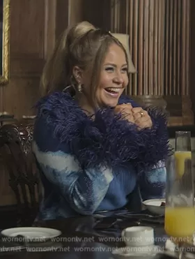 (played by Eve Austin) on You on Netflix was spotted wearing this blue printed feather trim top on You on episode 'Hampsie' (4x04) in Feb 2023. 's Top is the City of Angels Peggy Cardigan by House of Sunny.