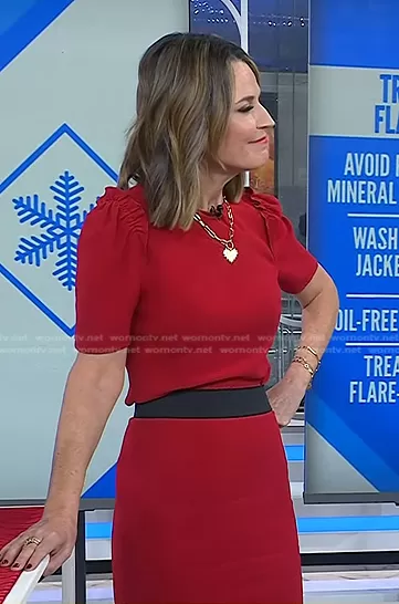 Savannah Guthrie on Today on NBC was spotted wearing this red short sleeve top and pencil skirt on Today on Sep 29 2025's episode. Savannah's Top is the Ruffled Short-Sleeve Blouse by Dolce & Gabbana . Savannah's Skirt is the Midi Tube Skirt by Dolce & Gabbana.