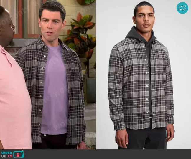 Dave Johnson (played by Max Greenfield) on The Neighborhood on CBS was spotted wearing this grey checked shirt on The Neighborhood on episode 'Welcome to the Milestone' (5x17) in Apr 2023. Dave's Shirt is the 100% Organic Cotton Midweight Flannel Shirt by Gap.