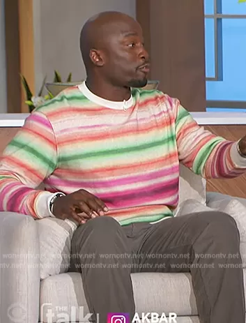 Akbar Gbajabiamila on The Talk on CBS was spotted wearing this striped sweatshirt on The Talk on Mar 10 2023's episode. Akbar's Sweater is the Cotton Gradient Stripe Regular Fit Crewneck Sweatshirt by Scotch and Soda.