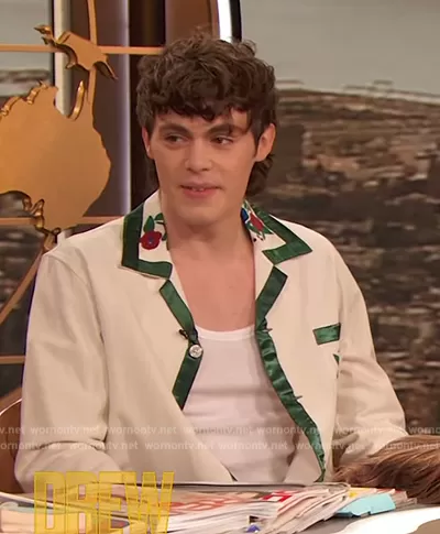 on The Drew Barrymore Show on CBS was spotted wearing this white floral embroidered shirt on The Drew Barrymore Show on Mar 12 2023's episode. 's Shirt is the Winter Garden Floral-Embroidered Overshirt by Bode.