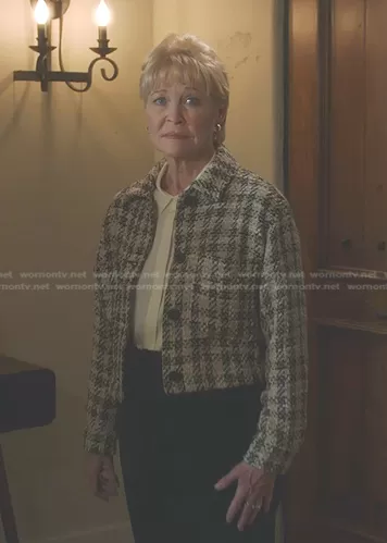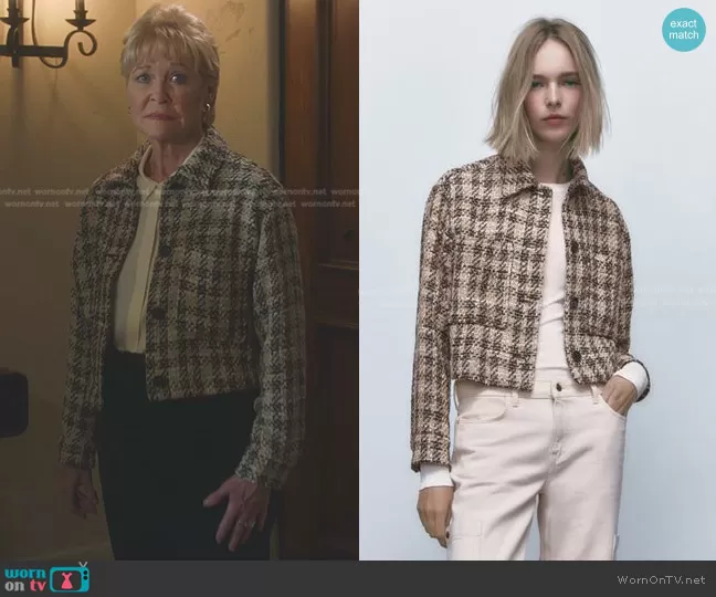 Margaret Buckley (played by Dee Wallace) on 9-1-1 on ABC was spotted wearing this beige plaid jacket on 9-1-1 on episode 'In Another Life' (6x11) in Mar 2023. 's Top is the Patch Pocket Textured Overshirt by Zara.