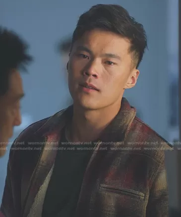 Albert Han (played by John Harlan Kim) on 9-1-1 on Fox was spotted wearing this Albert’s beige plaid jacket on 9-1-1 on episode 'In Another Life' (6x11) in Mar 2023. 's Jacket is the Martial Jacket by All Saints.