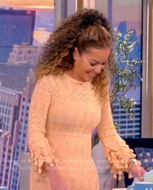 Sunny Hostin on The View on ABC was spotted wearing this beige pointelle dress on The View on Mar 14 2023's episode. Sunny's Dress is the Wonderland Tiered Knit Midi-Dress by Zimmermann.