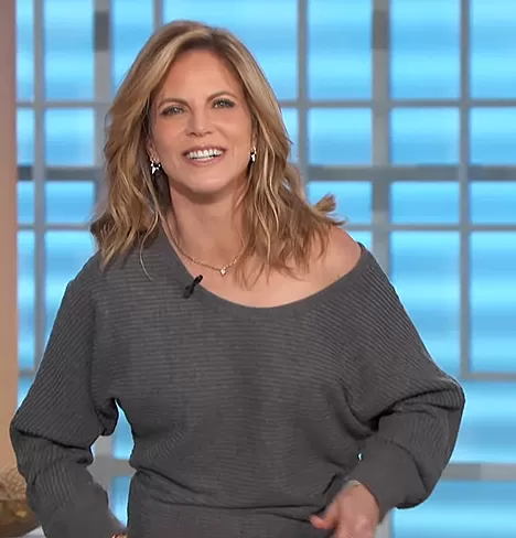 Natalie Morales on The Talk on CBS was spotted wearing this gray ribbed off shoulder sweater on The Talk on Mar 14 2023's episode. Natalie's Sweater is the Slouchy Dolman Long Sleeve Sweater by Joah Brown.