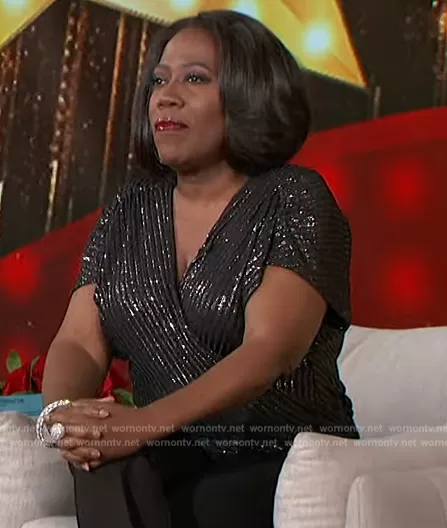 Sheryl Underwood on The Talk on CBS was spotted wearing this black metallic stripe wrap top on The Talk on Mar 15 2023's episode. Sheryl's Top is the Margie Crossover Top by Ramy Brook.