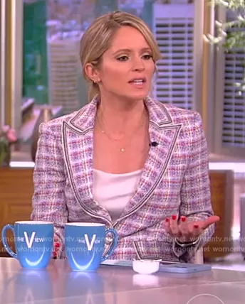 Sara Haines on The View on ABC was spotted wearing this checked tweed blazer on The View on Mar 16 2023's episode. Sara's Blazer is the Etney Dickey Jacket by Veronica Beard.