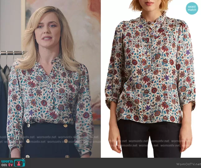 Sadie Ryan (played by Harriet Dyer) on American Auto on NBC was spotted wearing this white floral blouse on American Auto on episode 'Cost Cutting' (2x04) in Feb 2023. Sadie's Top is the Carlton Printed Top by Gerard Darel . Sadie's Skirt is the Ophelie Wool-Blend Skirt by Ralph Lauren.