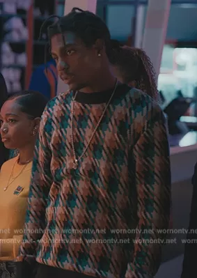 (played by ) on Bel-Air on Peacock was spotted wearing this Checkered sweater on Bel-Air on episode 'Don't Kill My Vibe' (2x04) in Mar 2023. 's Sweater is the Checked crewneck wool-blend sweater by Scotch and Soda.