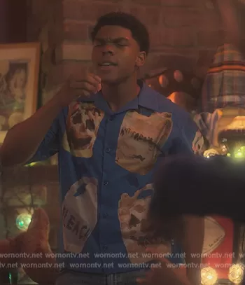 (played by ) on Grown-ish on Freeform was spotted wearing this Blue printed shirt on Grown-ish on episode 'Cash In Cash Out' (5x18) in Mar 2023. 's Shirt is the Boxy Fit Short Sleeve Shirt by Givenchy.