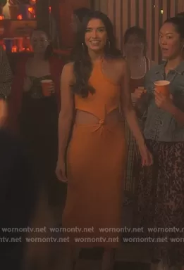 (played by ) on Grown-ish on Freeform was spotted wearing this Orange cutout twist front dress on Grown-ish on episode 'Cash In Cash Out' (5x18) in Mar 2023. 's Dress is the Cameron Cut Out Knit Midi Dress by Cult Gaia.