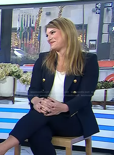 on Today on NBC was spotted wearing this navy double breasted blazer on Today on Mar 17 2023's episode. 's Jacket is the Miller Dickey Jacket in Navy With Gold Buttons by Veronica Beard.
