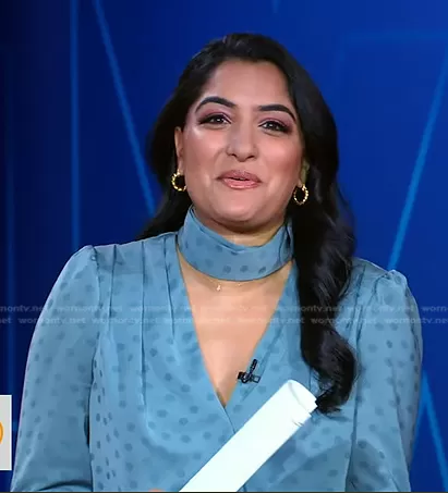 Reena Roy on Good Morning America on ABC was spotted wearing this blue polka dot top on Good Morning America on Mar 17 2023's episode. Reena's Top is the The Joan Polka Dot Jacquard Blouse by Favorite Daughter.
