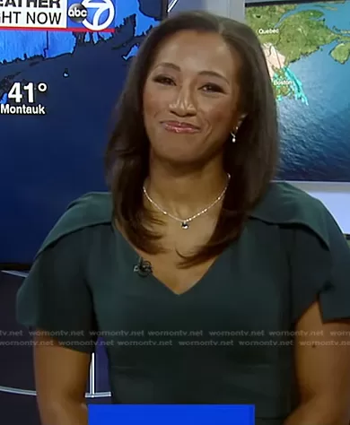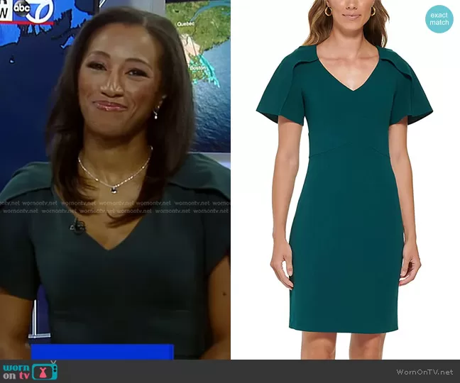 Brittany Bell on Good Morning America on ABC was spotted wearing this green flutter sleeve dress on Good Morning America on Mar 17 2023's episode. Brittany's Dress is the Cape Sleeve V-Neck Midi Dress by DKNY.