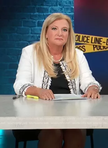 on Access Hollywood on NBC was spotted wearing this white tweed contrast jacket on Access Hollywood on Mar 18 2023's episode. 's Jacket is the Clair Knit 3/4-Sleeve Fringe-Trim Jacket by St. John Collection.