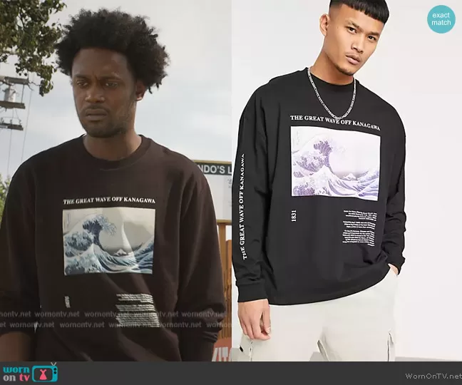 Noah Koles (played by Echo Kellum) on Grand Crew on NBC was spotted wearing this black wave graphic sweatshirt on Grand Crew on episode 'Pilot' (1x01) in Dec 2021. Noah's Shirt is the The Great Wave Of Kanagawa by ASOS.