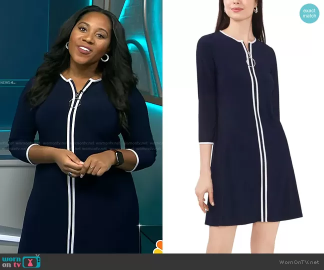 Kay Angrum on NBC News Daily on NBC was spotted wearing this navy contrast trim zip dress on NBC News Daily on Jul 31 2025's episode. Kay's Dress is the Center Stripe Minidress by Chaus.