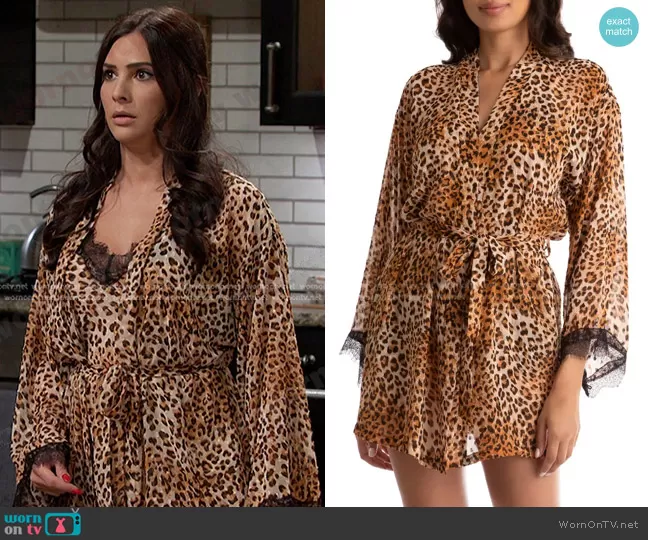 Gabi Hernandez (played by Camila Banus) on Days of our Lives on Peacock was spotted wearing this leopard chemise and robe on Days of our Lives on Mar 21 2023's episode. Gabi (old)'s Chemise is the Angela Leopard Print Cross Back Chemise by In Bloom by Jonquil . Gabi (old)'s Robe is the Angela Leopard Print Robe by In Bloom by Jonquil.