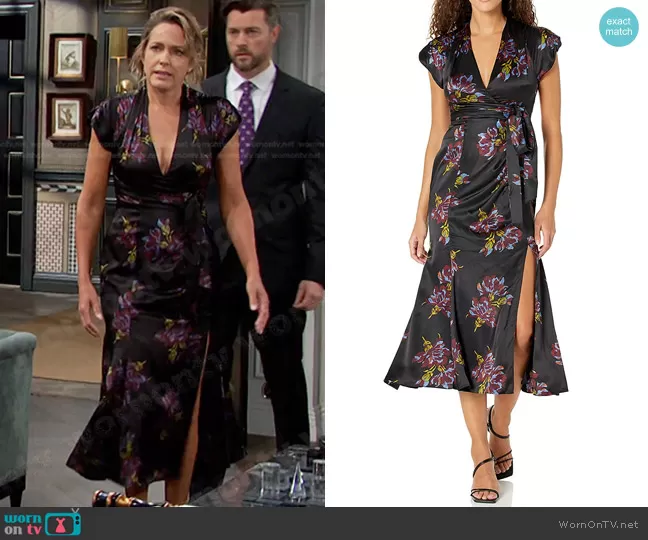 Nicole Walker (played by Arianne Zucker) on Days of our Lives on Peacock was spotted wearing this black floral wrap dress on Days of our Lives on Mar 21 2023's episode. Nicole's Dress is the Neila Silk Midi-Dress by Cinq a Sept.