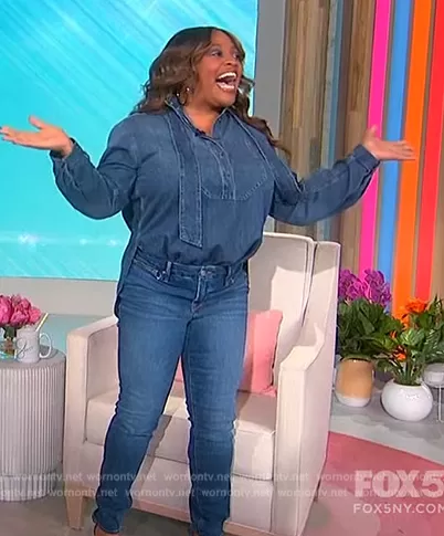 Sherri Shepherd on Sherri on FOX was spotted wearing this denim tie neck blouse on Sherri on Mar 21 2023's episode. Sherri's Top is the Una Denim Tie-Neck Blouse by Banana Republic.