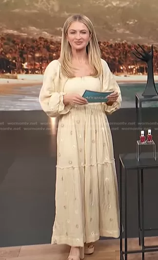 on Access Hollywood on NBC was spotted wearing this beige floral dress on Access Hollywood on Mar 21 2023's episode. 's Dress is the Dahlia Embroidered Maxi Dress in Pearl Island by Free People.