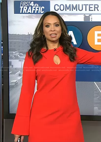 Adelle Caballero on Today on NBC was spotted wearing this red keyhole dress on Today on Nov 26 2024's episode. Adelle's Dress is the Keyhole Shift Dress by Derek Lam.