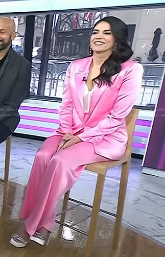 on Today on NBC was spotted wearing this pink blazer and pants on Today on Mar 22 2023's episode. 's Jacket is the Denny Notch Collar Blazer by Alice + Olivia . 's Pants is the Deanna Pant by Alice + Olivia.