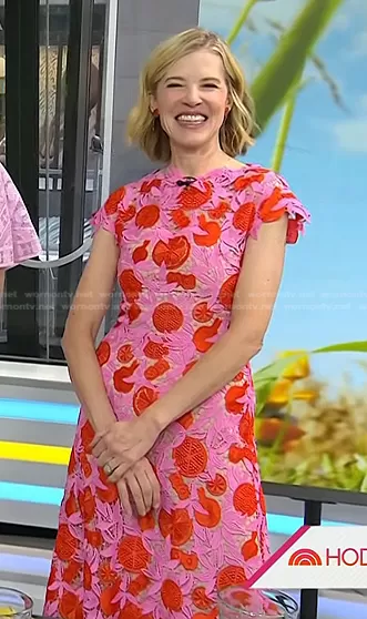 on Today on NBC was spotted wearing this pink and red fruit guipure dress on Today on Mar 22 2023's episode. 's Dress is the Fruit Guipure Lace Full Skirt Midi Dress by Lela Rose.