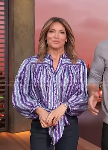 Kit Hoover on Access Hollywood on NBC was spotted wearing this purple floral striped blouse on Access Hollywood on Jul 31 2023's episode. Kit's Top is the Peninsula Silk Floral Stripe Cropped Blouse by Sandro.