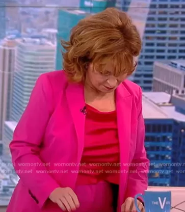 Joy Behar on The View on ABC was spotted wearing this pink blazer and top on The View on Mar 22 2023's episode. Joy's Top is the Harmon Cropped Draped Slip Tank by Alice + Olivia . Joy's Blazer is the Etiennette Wool Blazer by Theory . Joy's Pants is the Treeca Wool Crop Trousers by Theory.
